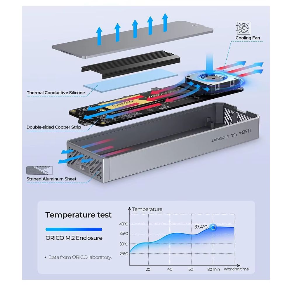** Refrigeración de alto nivel ** : El sistema de enfriamiento multinivel combina un ventilador integrado, carcasa de aleación de aluminio y almohadillas térmicas de silicona, aumentando en un 50% la eficiencia de disipación. Mantiene el SSD en temperaturas seguras, evitando sobrecalentamientos y pérdida de rendimiento incluso en uso continuo.