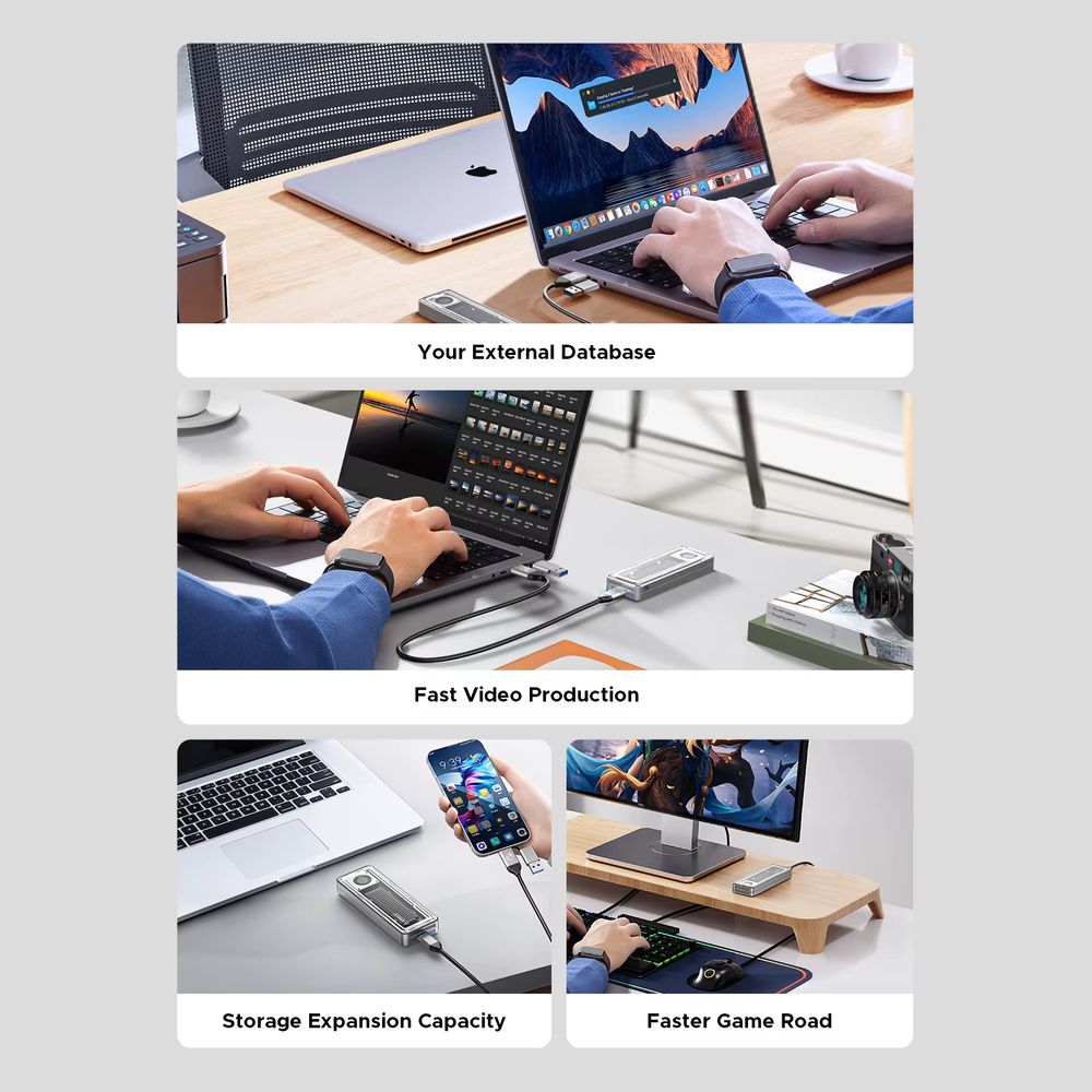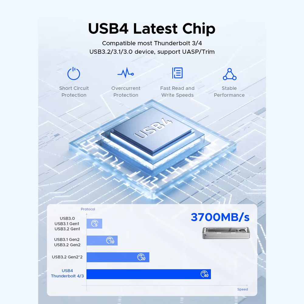 Es la última tecnología USB que hace que la velocidad de transferencia alcance los 40Gbps, permitiendo la transferencia de archivos de 3GB en sólo un segundo. Probado en portátiles con interfaz Thunderbolt 4, alcanza velocidades de lectura y escritura de hasta 3500/2500MB/s. lo que es 3 veces más rápido que la mayoría de carcasas SSD que suelen utilizar tecnología USB 3.2